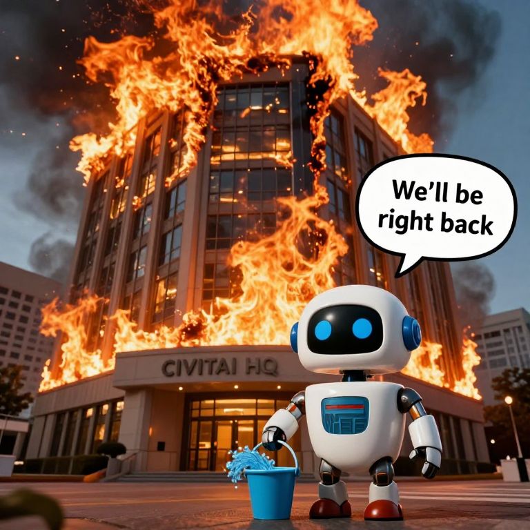 A whimsical clockwork robot with a glowing wrench, surrounded by floating gears and circuit boards, working on a sign that reads 'Civitai Under Maintenance', A glowing 'be right back' sign hangs in the background, with sparks of magic and light creating an aura of busy repair