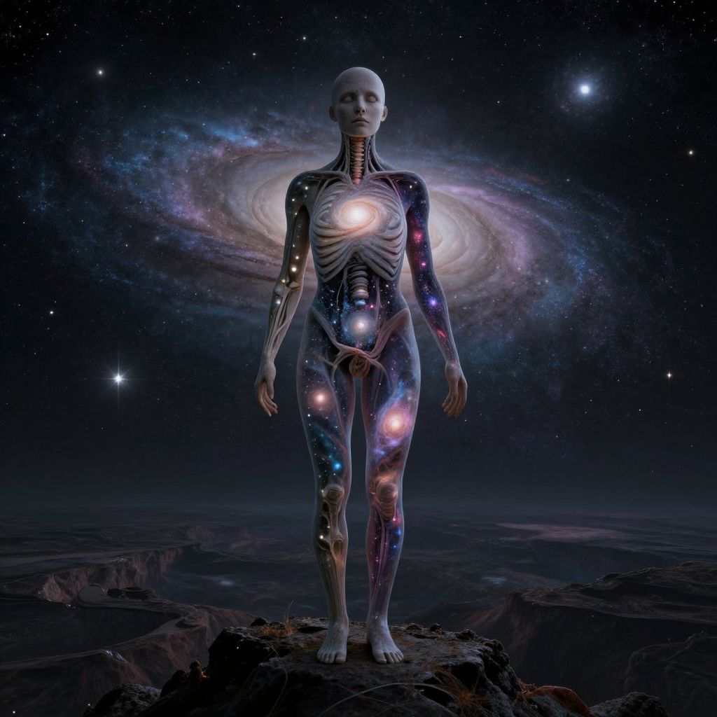 Photograph-like CGI image of a bald, androgynous, human-like figure standing on a rocky surface in a starry, cosmic background. The figure's body is transparent, revealing internal organs and glowing stars and galaxies within. The chest displays a bright, circular white light, with various colorful celestial patterns in the limbs. A large, spiral galaxy dominates the background, adding a sense of depth and space. The figure's skin tone appears dark due to the contrast with the glowing interior. The overall composition merges human anatomy with the cosmos, creating a surreal, otherworldly effect.