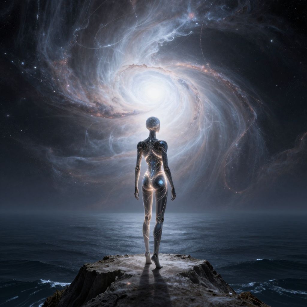 Digital artwork of a bald, humanoid figure with glowing internal lights, standing on a rocky surface in space, surrounded by a spiral galaxy and stars.
