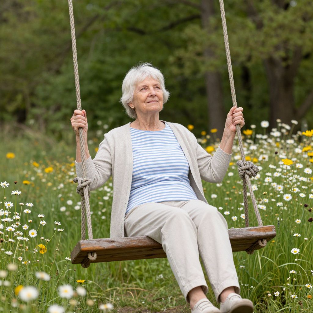 A serene elderly woman sits gracefully on a rustic wooden swing, her hands gripping weathered ropes as she enjoys a peaceful moment amidst a vibrant meadow filled with daisies and wildflowers, her joyful expression radiating contentment against a backdrop of lush green trees.