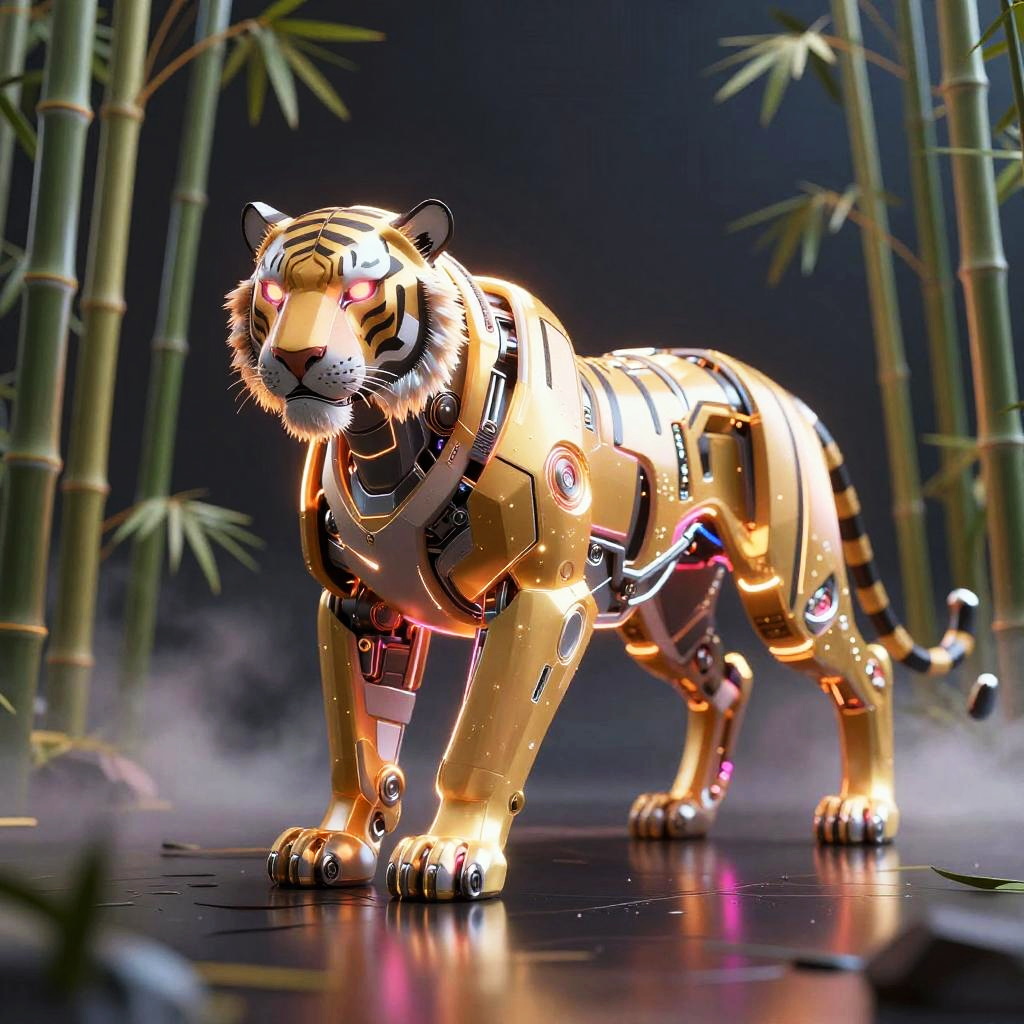 Digital art of a robotic golden tiger with glowing pink circuits, walking through a bamboo forest with misty water reflections.