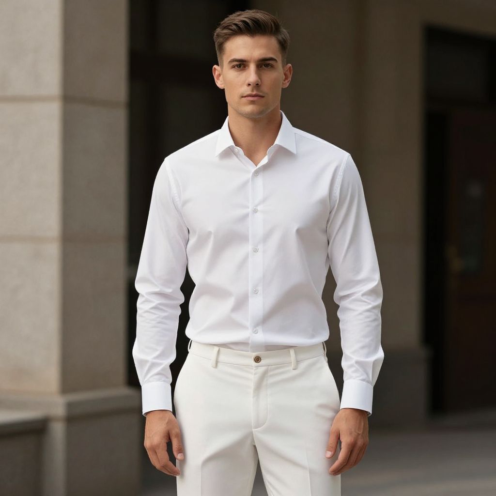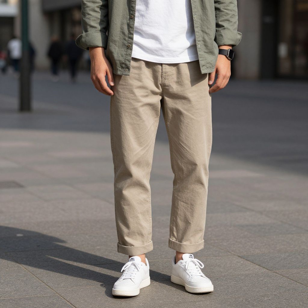 Man with short brown hair, wearing a white shirt and beige pants with a pocket on the left side and a pair of sandals on his feet. The man is standing on a street with a building in the background.