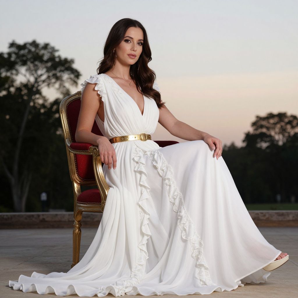 Elegant portrait of a woman seated in a luxurious red chair with gold accents, wearing a flowing white gown adorned with delicate ruffles and a golden belt, set against a serene outdoor backdrop featuring trees and a soft gradient sky.