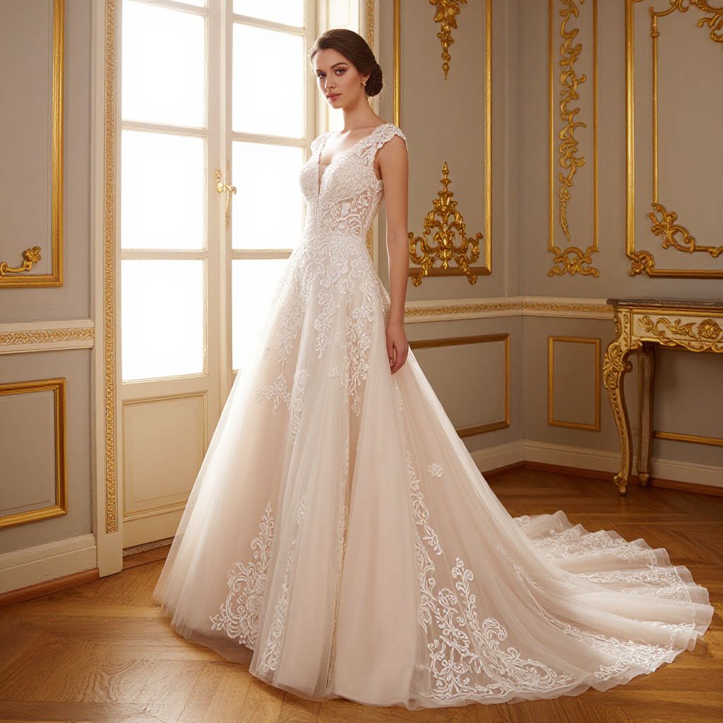 Elegant blush tulle and lace wedding gown gracefully flowing as a woman stands poised in a luxurious, classically designed room with ornate gold accents and soft natural light streaming through a window.