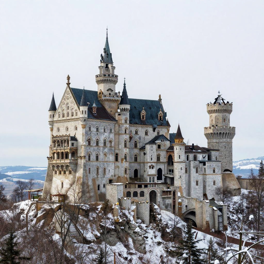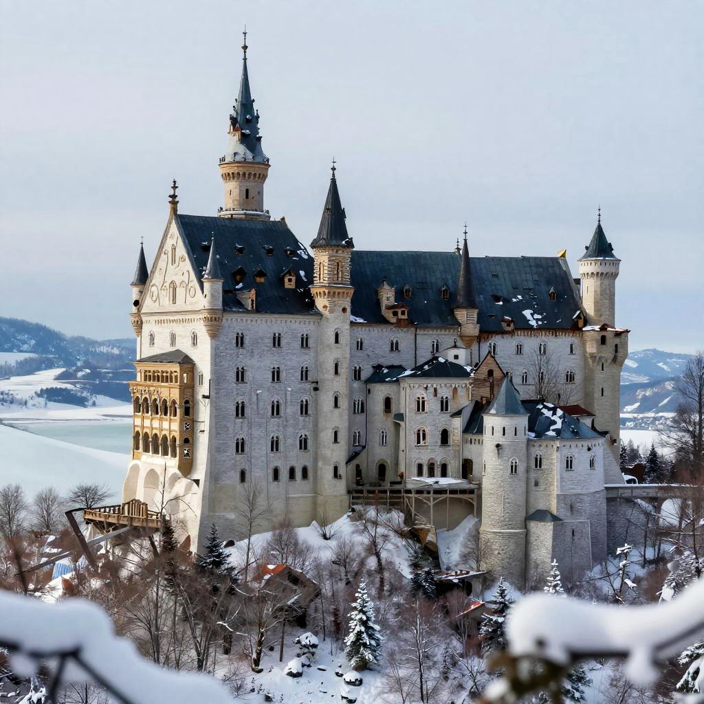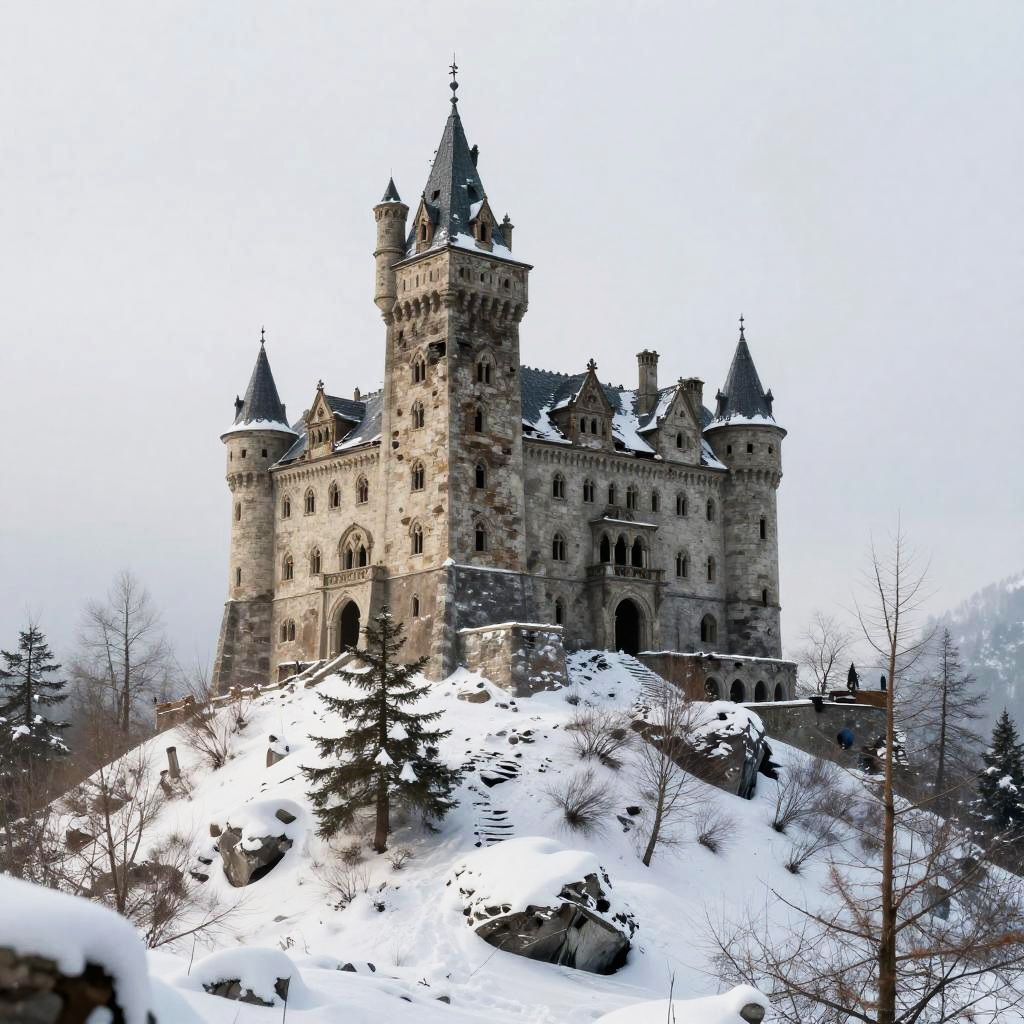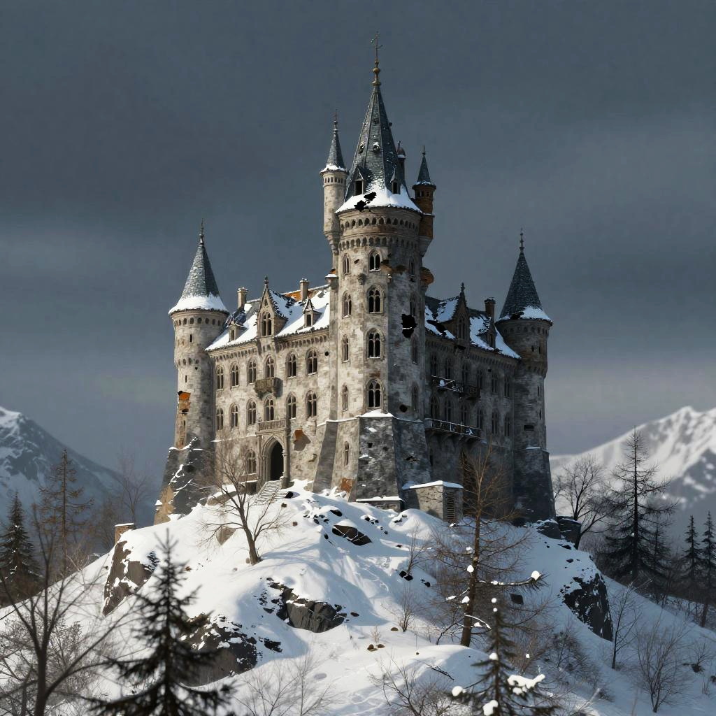 Photograph of a majestic, snow-covered medieval castle with multiple tall, pointed towers, set against a dark, cloudy sky. The castle, made of light gray stone, has intricate, gothic-style architecture with arched windows and small, square balconies. Snow blankets the castle's roofs and the surrounding rocky terrain, with snow-covered evergreen trees scattered around the base. The foreground includes a steep, snowy slope leading up to the castle, adding a sense of grandeur and isolation. The background shows distant, shadowy mountain peaks partially obscured by mist. The overall atmosphere is one of eerie, winter enchantment.