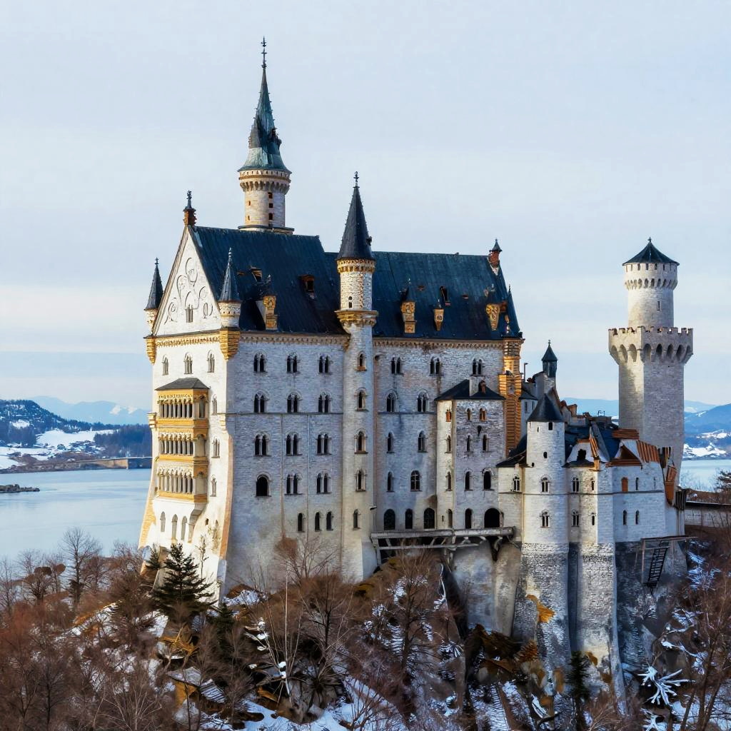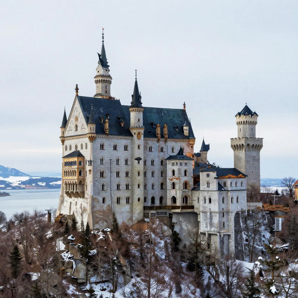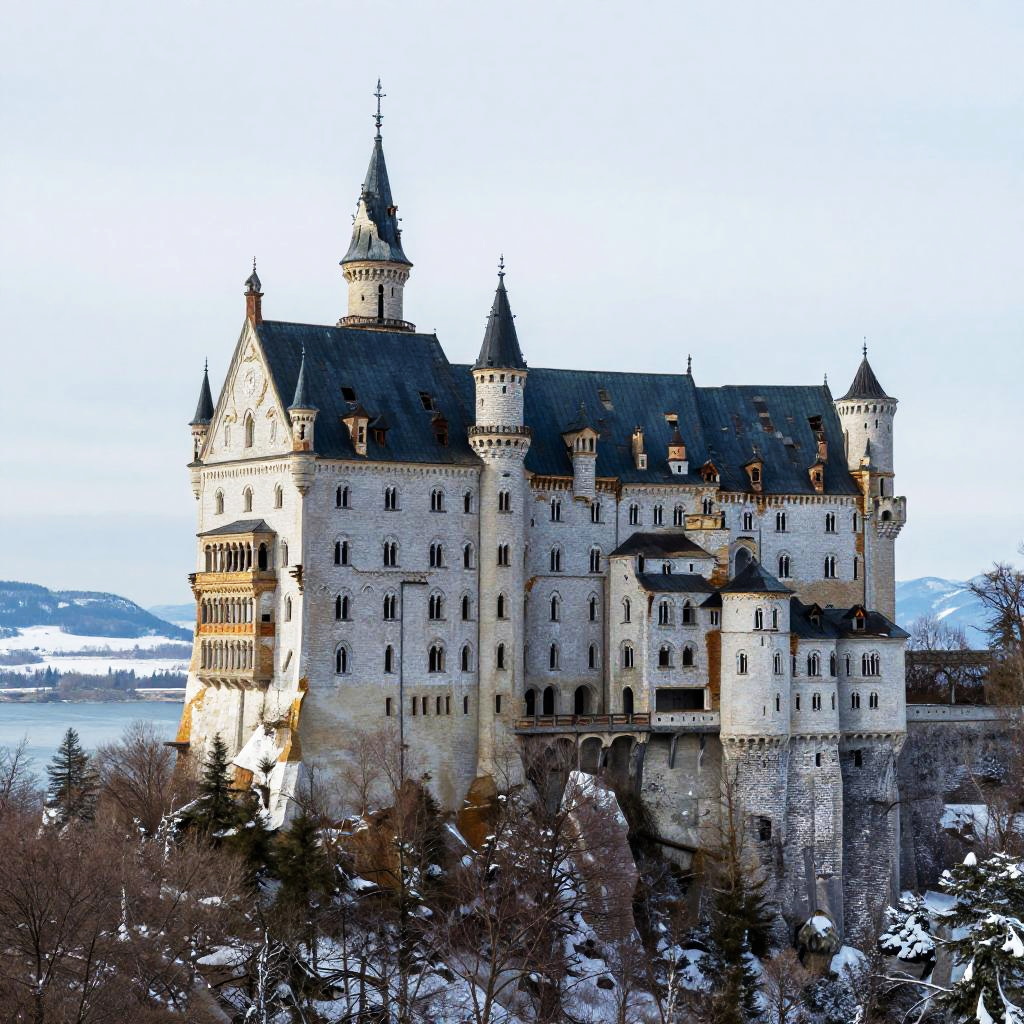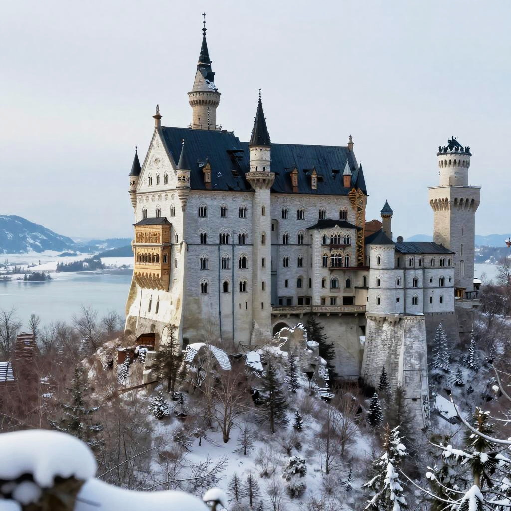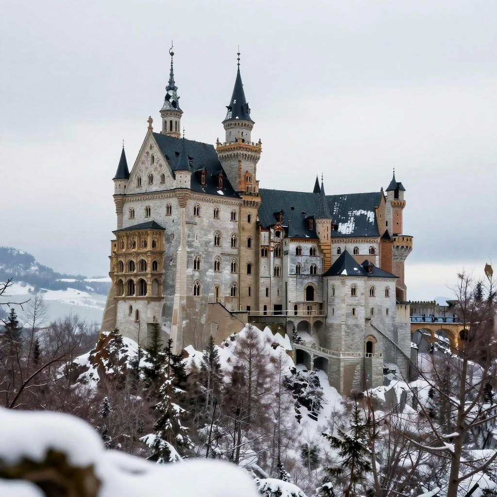 Photograph of a majestic, snow-covered medieval castle with multiple tall, pointed towers, set against a dark, cloudy sky. The castle, made of light gray stone, has intricate, gothic-style architecture with arched windows and small, square balconies. Snow blankets the castle's roofs and the surrounding rocky terrain, with snow-covered evergreen trees scattered around the base. The foreground includes a steep, snowy slope leading up to the castle, adding a sense of grandeur and isolation. The background shows distant, shadowy mountain peaks partially obscured by mist. The overall atmosphere is one of eerie, winter enchantment.