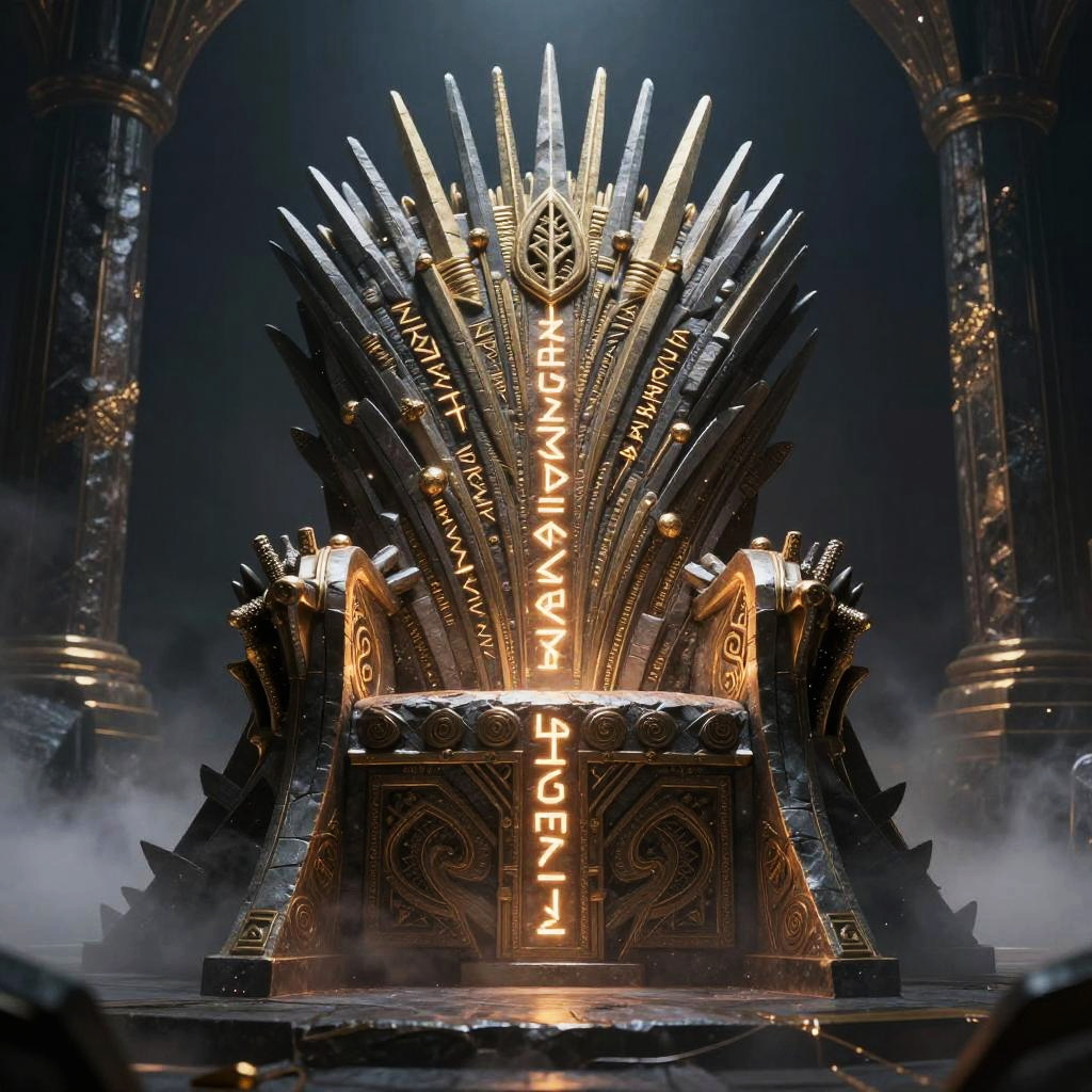 Throne concept art featuring an ancient, ornate seat with glowing runes, surrounded by mystical fog and dark stone pillars, dramatic lighting, fantasy epic style