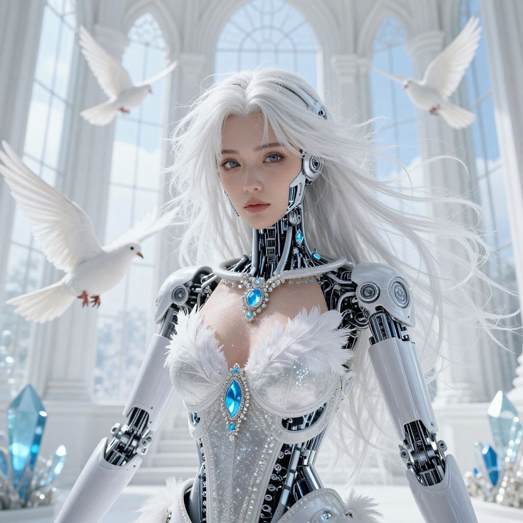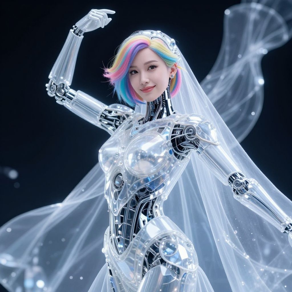Score_9, score_8_up, score_7_up, ultra-detailed, realistic, photo-realistic, High-definition face drawing, RAW photo, official art, detailed background, (wearing clothes:1.5), dynamic pose, (imagination of joy), (Nice face), multicolored hair, (Dip dye hair:1.1), (Mechanical body: 1.3), (Beautiful curved crystal body: 1.5), (Translucent glass costume along the lines of the body: 1.5), (Thin veil of light: 1.2), (The whole body looks like it is made of porcelain. White skin: 1.5)