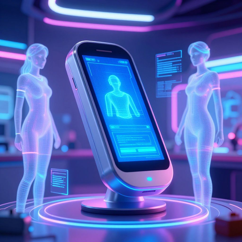Photorealistic CGI image depicting a futuristic neon-lit laboratory. Central focus is a tilted, glowing smartphone displaying a holographic blue silhouette of a woman with pixelated texture. Two translucent, white-wireframe female figures stand symmetrically on either side, illuminated by vibrant blue and pink neon lights. Background features blurred, colorful neon lights, enhancing the sci-fi ambiance. The phone rests on a circular, illuminated platform, adding to the high-tech aesthetic. The overall scene combines elements of cyberpunk and digital art, emphasizing futuristic technology and holographic interfaces.
