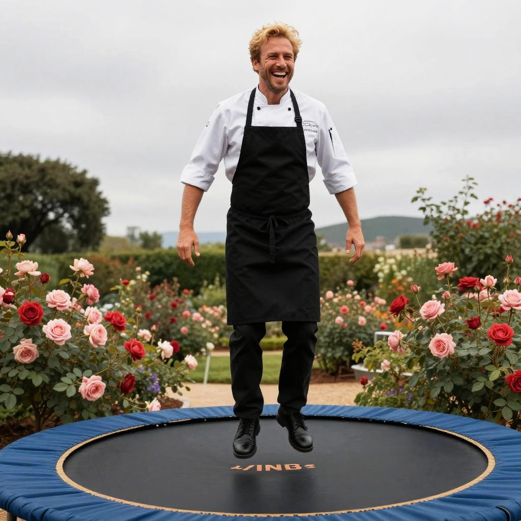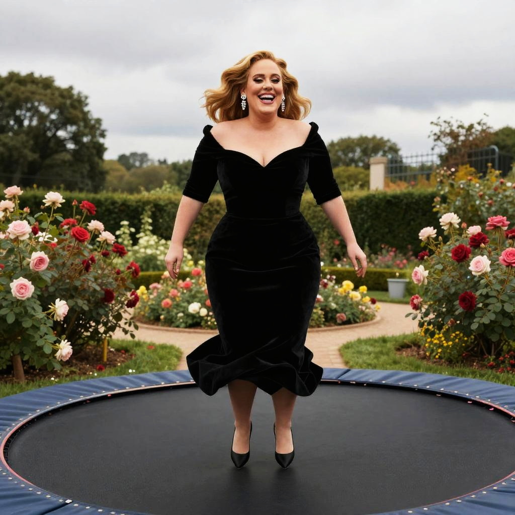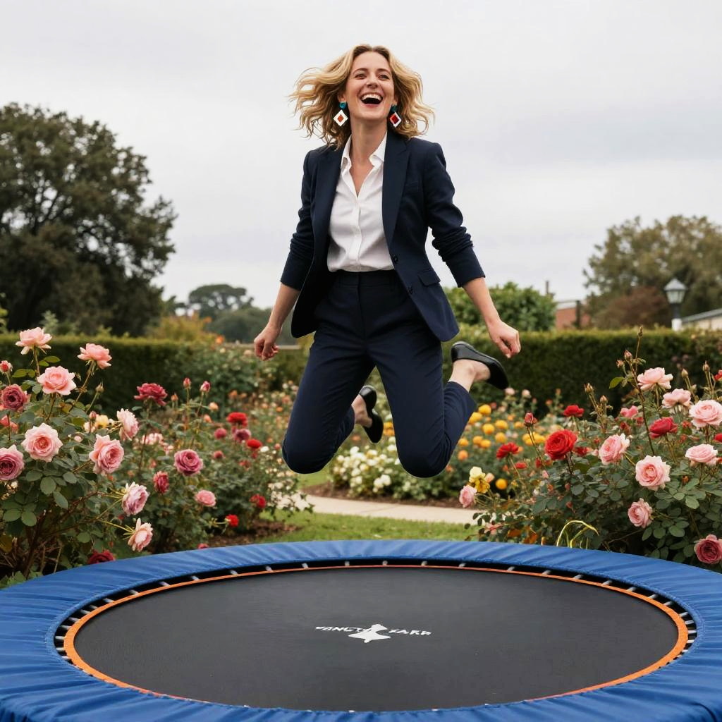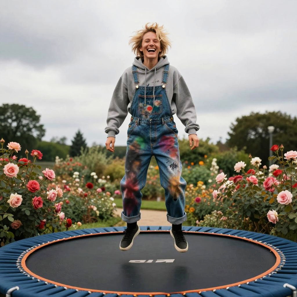 Ballet Dancer Jumping on Trampoline in Rose Garden