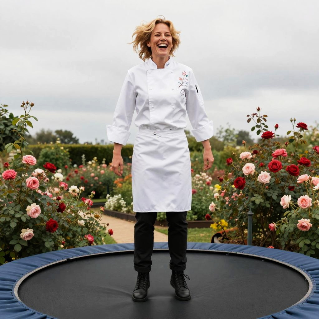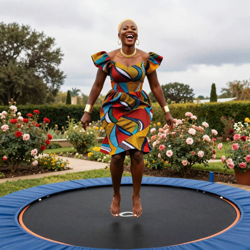 Photograph of a 38-year-old dancer resembling Misty Copeland in a modern role, with light blonde hair, laughing and jumping on a trampoline in a rose garden. Shot with a wide-angle lens in the style of Annie Leibovitz for Vanity Fair, featuring a minimalist high-neck, form-fitting black leotard with gold accents, emphasizing joy and beauty.