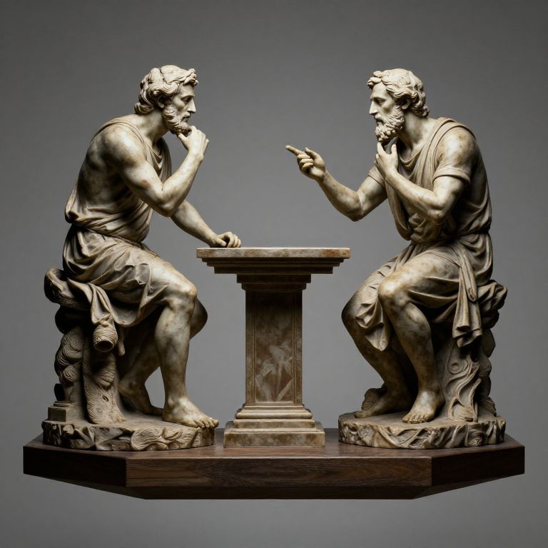 Statues of philosophers come alive at midnight to debate with their own ideas, sparring intellectually around a floating podium.