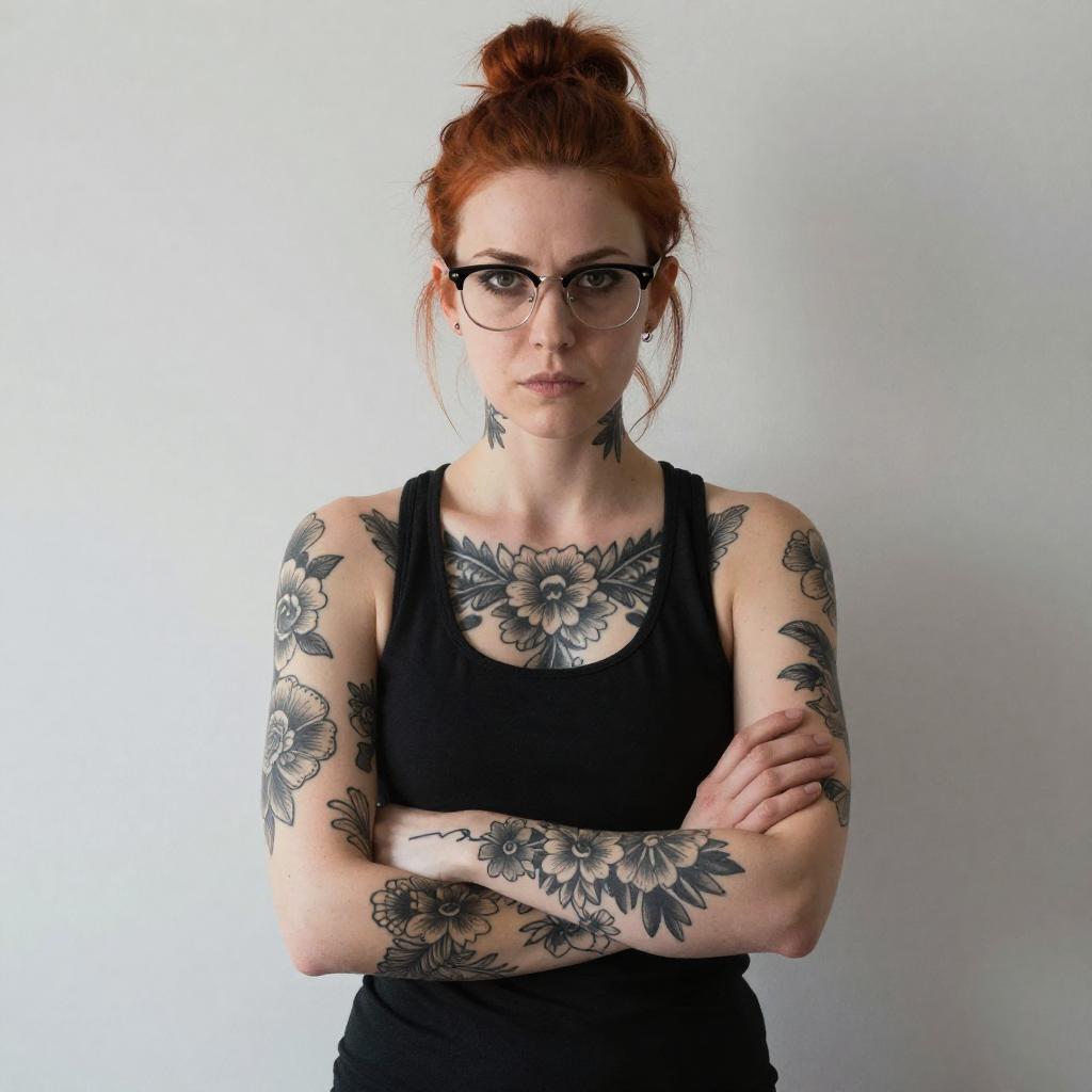 Photograph of a pale-skinned woman with red and brown hair in a bun, wearing glasses and a black tank top. She has extensive black floral tattoos on her arms, chest, and neck. She stands against a ured white wall, arms crossed, with a serious expression. Her red hair contrasts with her dark tattoos and black top.