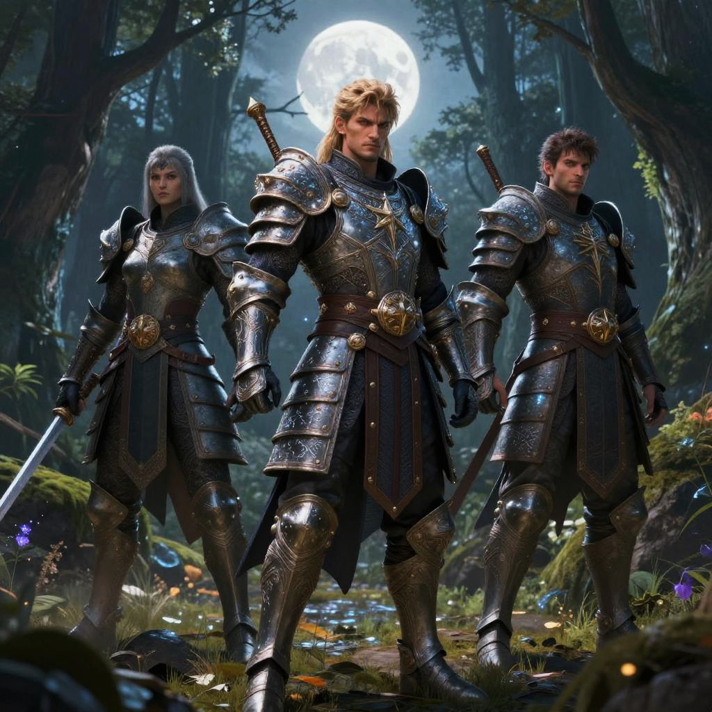 AI prompts for characters featuring fantasy warriors with elaborate armor and glowing runes, standing in mystical forests under moonlight, detailed textures, dynamic poses, rich color palettes blending natural and magical elements, fantasy illustration style.