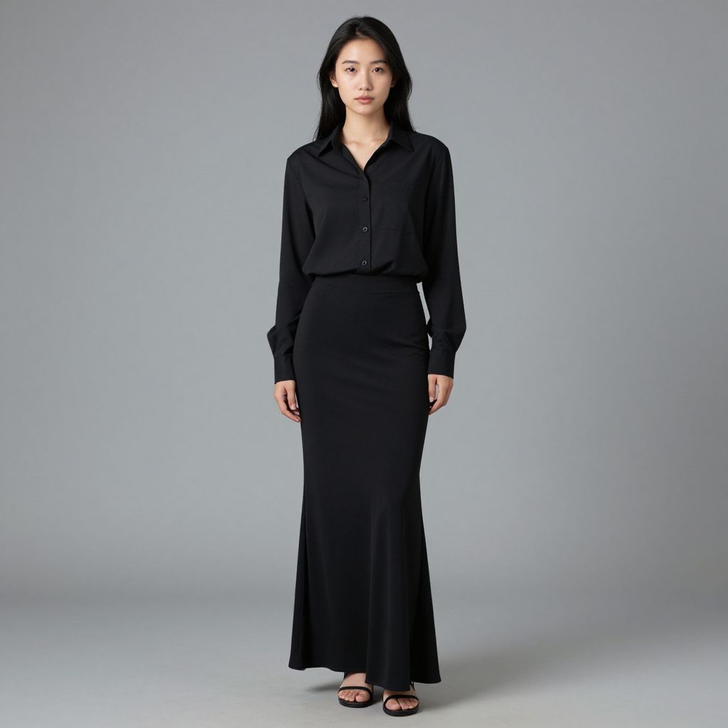 "beige skirt outfit costume, 1girl, solo, shirt, skirt, standing, white shirt, sandals, looking at viewer, full body, realistic, black hair, brown skirt, arms at sides, long hair, outdoors, long skirt Realistic photo of casual sexy person with pretty face"