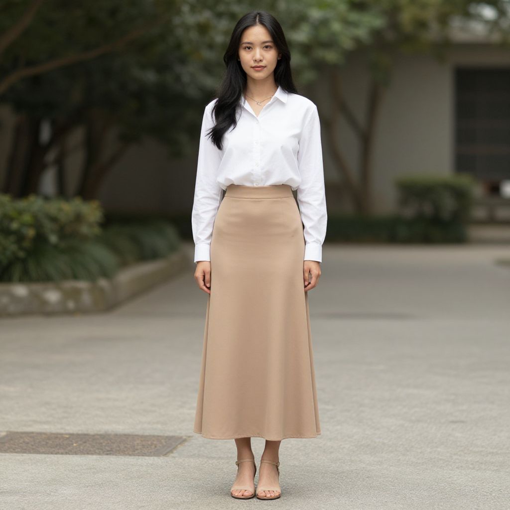 Photograph of an Asian woman standing outdoors on a concrete pathway. She has long, straight black hair and a neutral expression. She wears a white, long-sleeve blouse tucked into a high-waisted, beige, knee-length skirt. She is also wearing nude-colored, open-toed flat shoes. The background features blurred greenery and a building with dark windows. The image has a soft focus with natural light, giving it a slightly dreamy quality. The woman's attire is simple and elegant, emphasizing a minimalist style.