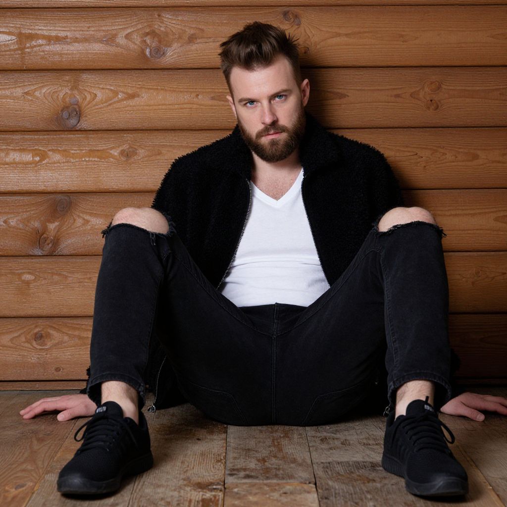 Photograph of a bearded man with dark curly hair, standing in front of a colorful, graffiti-covered wall. He's wearing a brown leather jacket over a black shirt and black pants. His intense, blue-eyed gaze contrasts with the vibrant, chaotic background filled with various spray-painted tags and symbols in blues, yellows, and oranges. The overall vibe is edgy and urban.