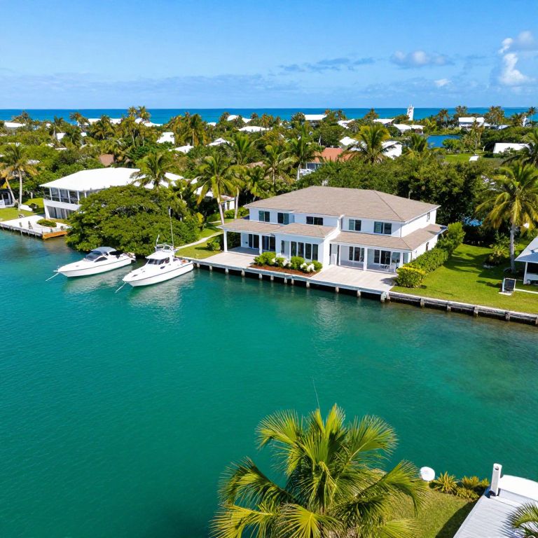 Aerial view of Pumpkin Key, showcasing a serene private island in Key Largo, Florida, featuring a pristine turquoise lagoon, lush greenery, a modern white house with a brown roof, and two boats anchored near the shore, all under a clear blue sky.