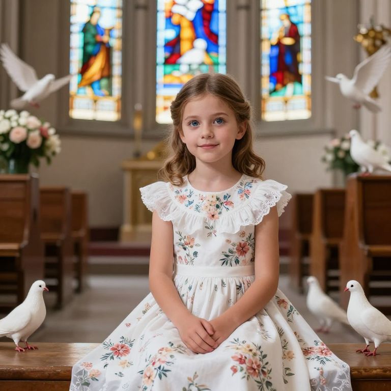 A young girl with soft brown hair and bright blue eyes wearing a pretty first communion dress, the dress is floral and white with a frilled collar, sitting in a sunny church courtyard with stained glass windows reflecting colorful light, surrounded by white doves and flower arrangements, realistic photography style