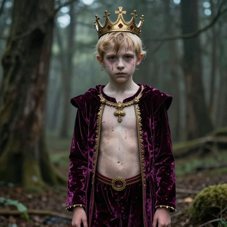 Wet-In-Wet A 10 year old Selfish King, Skinny and blond, wearing a velvet outfit. Style of Folk Horror,