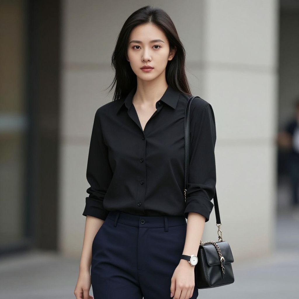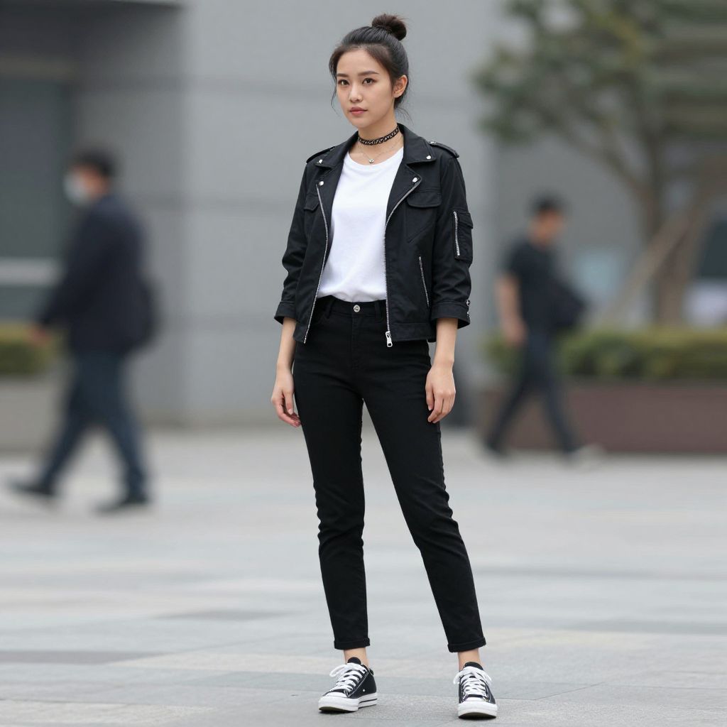 "cyberpunk costume female, 1girl, solo, denim jacket, jacket, sneakers, black hair, shoes, shirt, full body, standing, blurry background, bag, outdoors, blurry, pants Realistic photo of casual sexy person with pretty face"