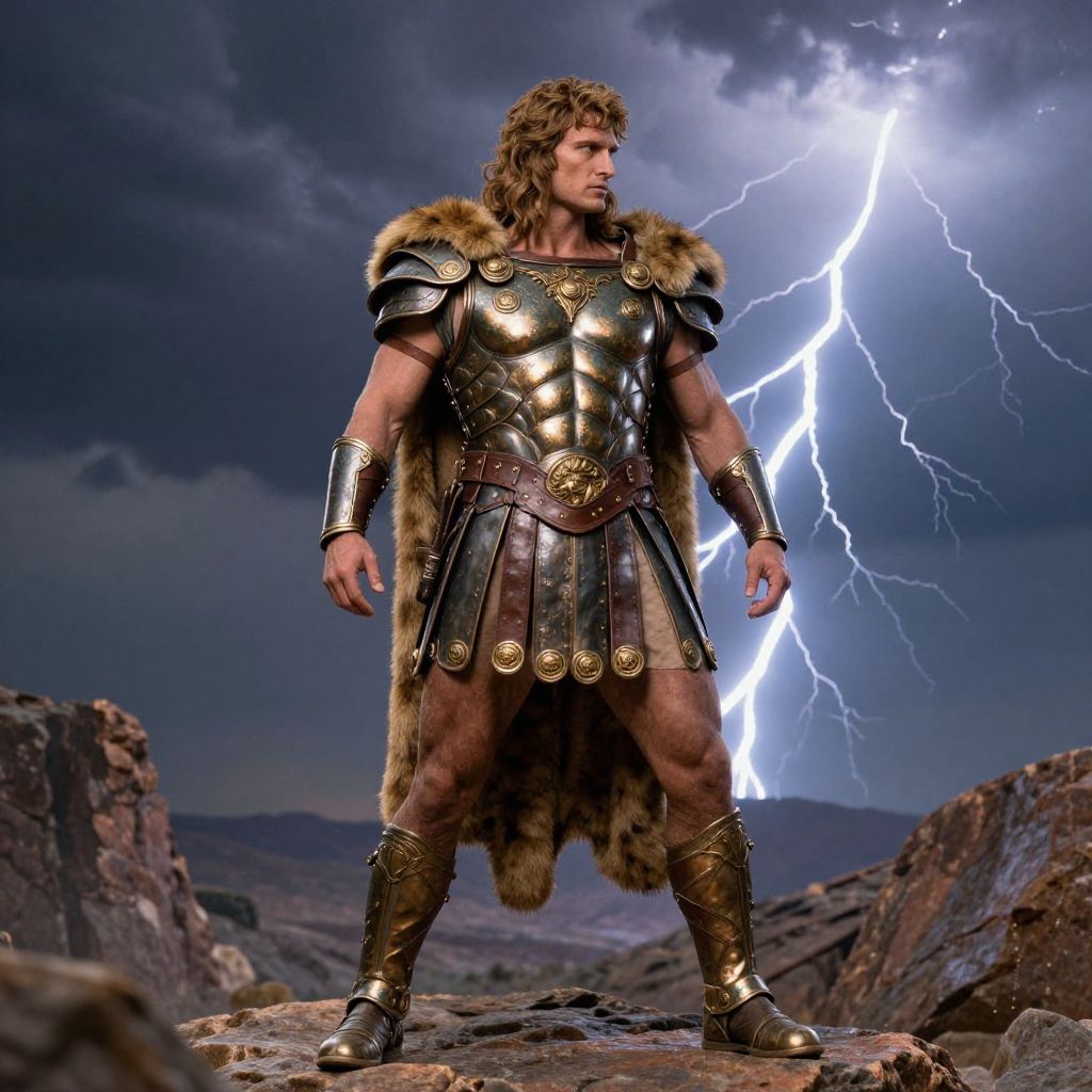 Muses Hercules costume design combining classical armor and mythical elements, showcasing detailed bronze chest plates, leather straps, a lion skin cape, and a heroic stance on rocky terrain under a dramatic sky filled with lightning.