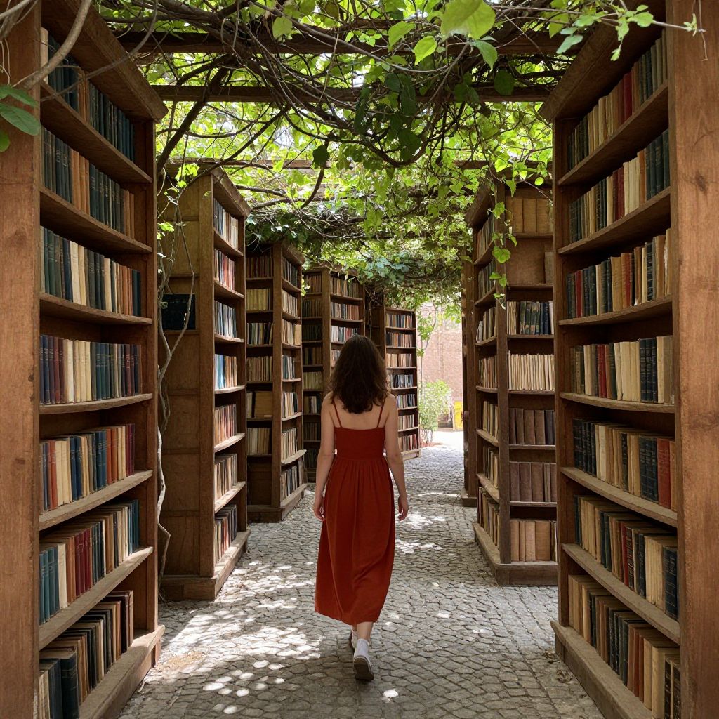 Photograph of a woman with curly brown hair, wearing a sleeveless, floor-length red dress and white socks, walking away from the camera down a narrow, cobblestone library aisle. The aisle is flanked by tall wooden bookshelves filled with colorful books, and overhead, lush green leaves create a natural canopy. Sunlight filters through the leaves, casting dappled shadows on the ground. The woman's back is to the camera, and she is positioned centrally in the image, creating a sense of depth and tranquility.