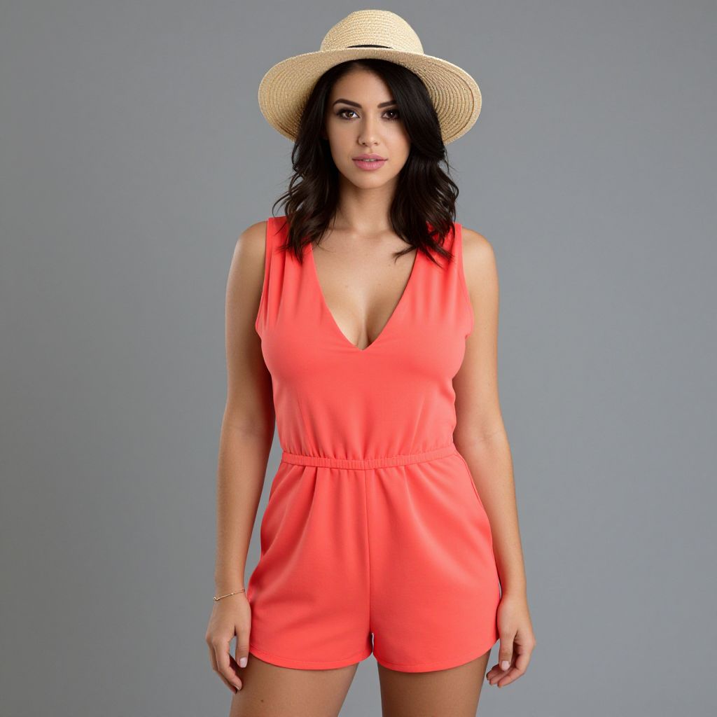 "Woman, casual summer, coral romper with a plunging v-neckline, sleeveless, fitted waist, short bottoms, straw fedora hat, minimal jewelry with thin bracelets, plain grey studio background.. Sexy. Pretty face and beаutiful eyes. Big breasts."