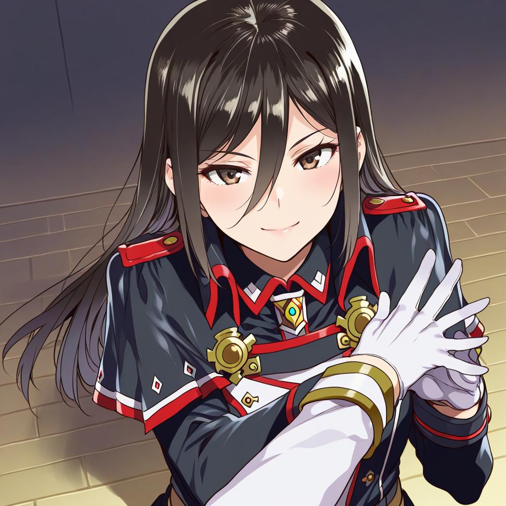 Morag ladair (xenoblade), xenoblade chronicles (series), 1girl, brown eyes, hair between eyes, black hair, long hair, military uniform, white gloves, military uniform, by artist mizuryu kei, illustrious