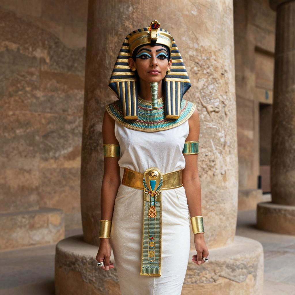 A woman dressed in an ancient Egyptian costume standing in front of a large stone column. She is wearing a traditional white dress with a detailed gold and turquoise collar, matching belt, arm cuffs, and a striped blue and gold pharaoh headdress. Her makeup features bold, dramatic eyeliner inspired by ancient Egyptian styles.