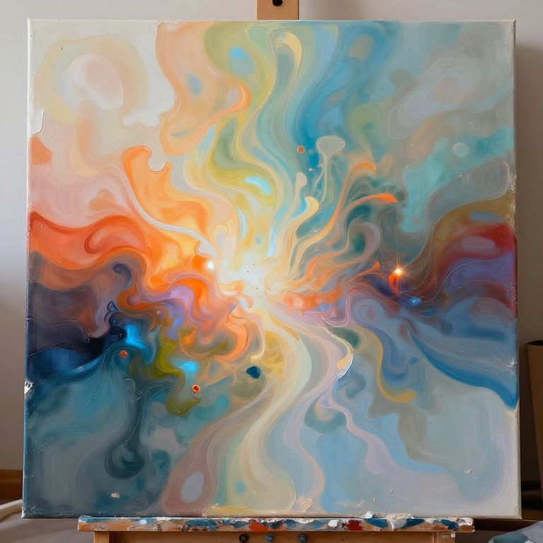 Abstract painting of swirling colors: vibrant oranges, blues, greens, and yellows blend in fluid, marbled patterns with a bright central light.
