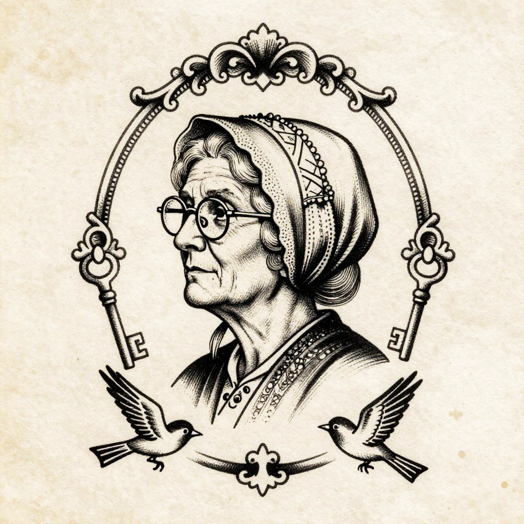 Monochrome ink illustration in a vintage tattoo flash aesthetic featuring elderly woman in profile wearing an antique bonnet and glasses, framed by baroque frame above, ornate keys flanking, and a small bird in flight below. Printed on tea-stained vellum, with crisp linework, stippling and crosshatching, bold negative space, subtle vignette, museum-print finish, high contrast, fine detail, gritty yet elegant mood.