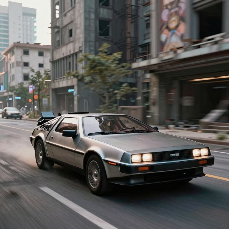 Photograph of the delorean, with a sleek spoiler, driving down the streets of a cyberpunk abandoned city, by greg rutkowski, by stanley artgerm, by alphonse mucha