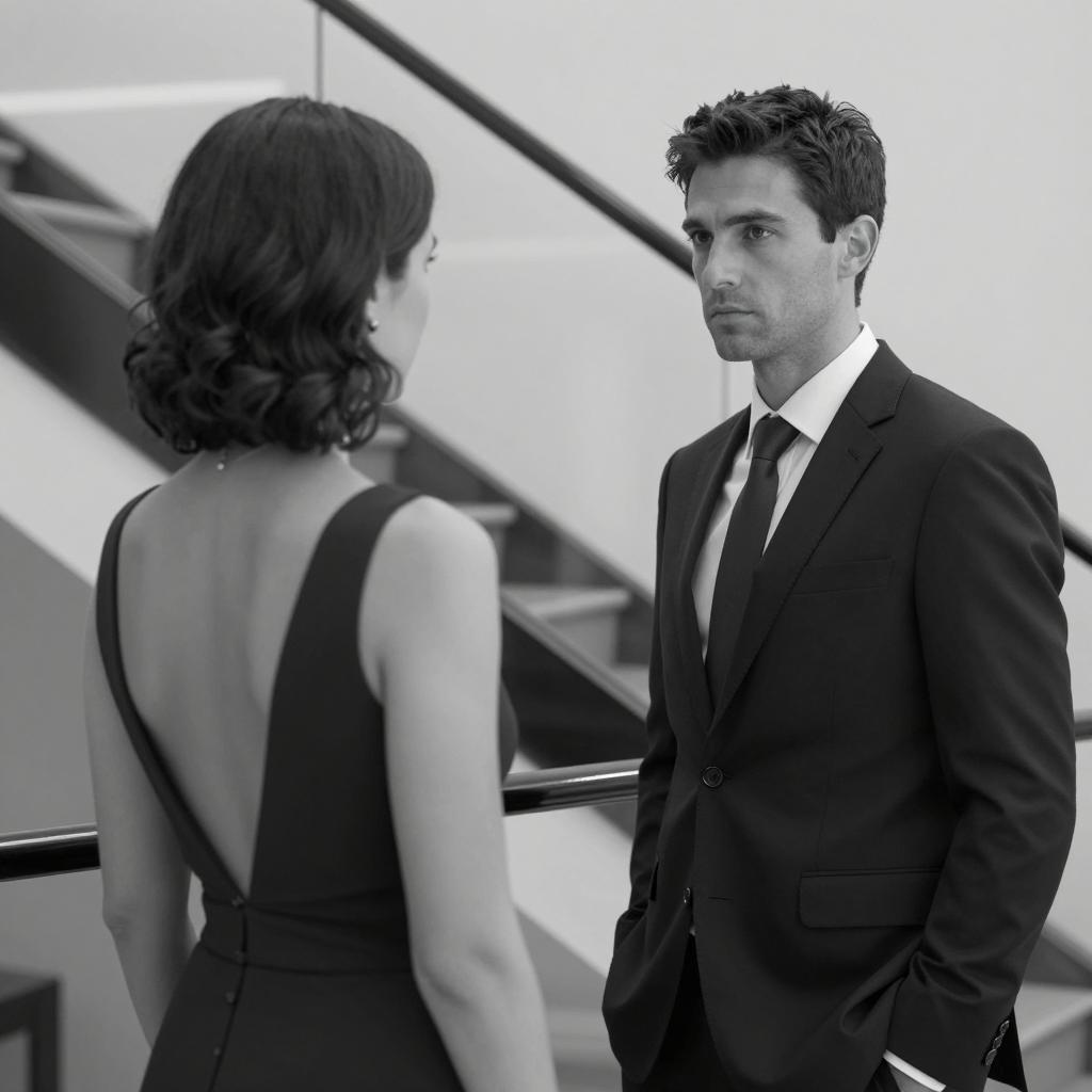 Photograph of a man and woman on a concrete sidewalk. Man in dark suit, fedora, squatting, helping woman in white dress, hat, and black purse. Woman crouching, touching pavement. Grass patches on sidewalk. Overcast lighting. Man's focused expression, woman's neutral.