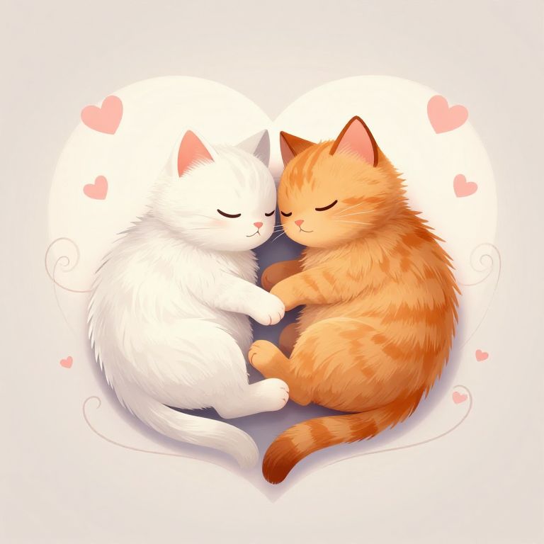 In this captivating illustration, two adorable cats, one white and one orange, are nestled together in a heart shape, their bodies forming the curves of the heart. Their eyes are closed, suggesting a peaceful slumber, and their noses touch gently, creating a sense of intimacy and affection. The white cat's fur is soft and fluffy, while the orange cat's fur has a rich, warm hue. Surrounding the heart shape are delicate, swirling lines and small, pink heart shapes, adding to the overall romantic and serene atmosphere. The background is a simple, muted gradient, allowing the heart and the cats to stand out prominently. The entire composition is harmonious and visually pleasing, with the cats' positions and the heart shape creating a balanced and symmetrical arrangement.