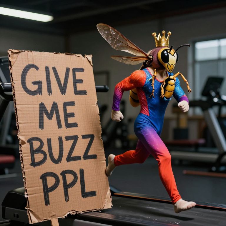“A large, detailed wasp with a tiny golden crown, dressed in a fitted gymnast suit in vibrant colors, running on a treadmill, Beside the treadmill is a worn, rotten cardboard sign that reads ‘GIVE ME BUZZ PPL’ in rough, hand-drawn letters, Shot with a Panavision 105mm lens to capture a cinematic, high-resolution close-up, emphasizing the wasp’s intricate wing structure, the textures on its exoskeleton, and the suit fabric, The background shows a softly blurred gym environment, with moody, high-contrast lighting and deep colors highlighting each detail on the wasp, the cardboard sign, and the treadmill, creating a whimsical yet dramatic scene