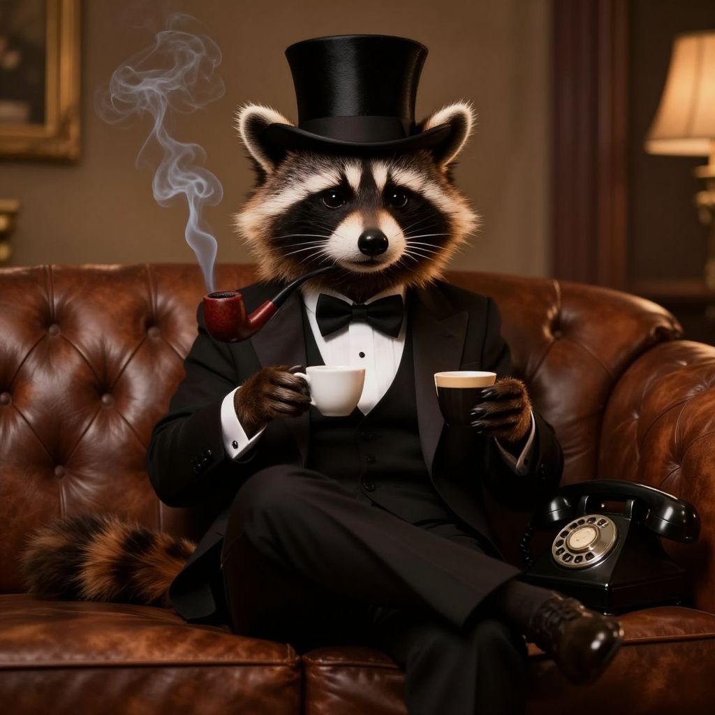 A highly detailed 8K resolution image of an anthropomorphic raccoon dressed in a black tuxedo with a bow tie and top hat. The raccoon is sitting on a brown leather couch in a sophisticated studio setting, holding a smoking pipe and a cup, accompanied by a vintage telephone. The scene is illuminated with warm, soft studio lighting, rendered in a detailed video game art style.