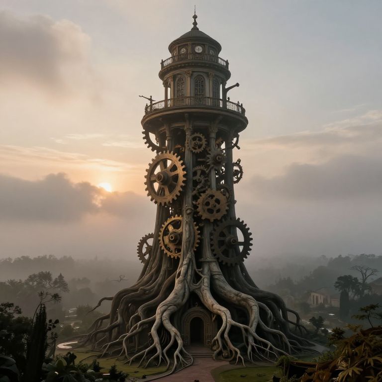 A surreal scene unfolds, blending Victorian-era grandeur with organic forms, reminiscent of Dali's dreamscapes and Giger's biomechanical artistry. At the heart of this enigmatic landscape stands an immense tower, its gears and cogs entwined with gnarled tree roots, defying the natural order. From a vantage point at the base of the tower, one is struck by both its colossal scale and intricate details, as if witnessing a marriage between technology and nature. As dawn's first light pierces through the misty canopy, an air of unease and wonder pervades, beckoning viewers to unravel the mysteries concealed within this marvel that transcends conventional understandings of time and space.