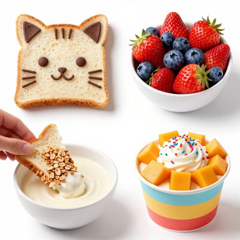Four vibrant snack ideas for kids, featuring a cat-shaped toast with chocolate details, a bowl of fresh strawberries and blueberries, a hand dipping a granola-topped slice into creamy soup, and a colorful cup filled with mango cubes topped with whipped cream and sprinkles, all promoting healthy eating habits.