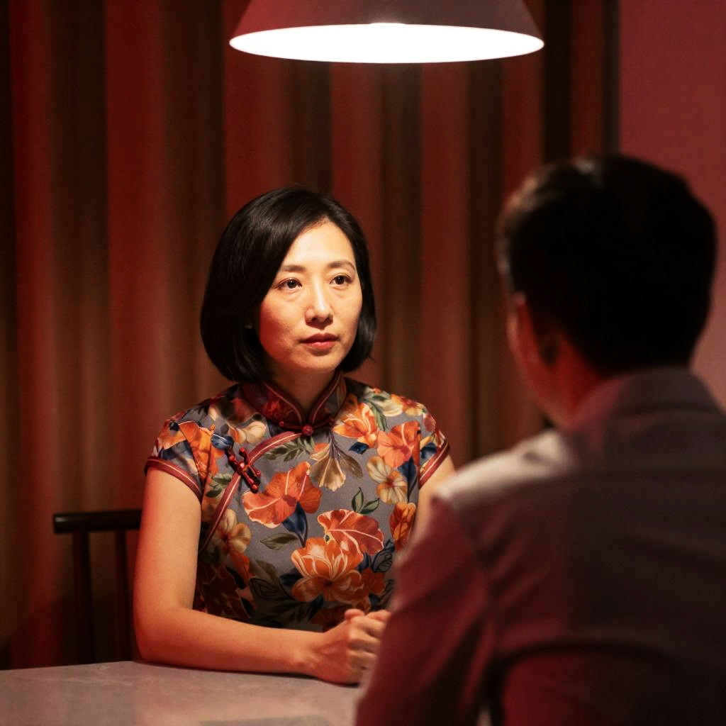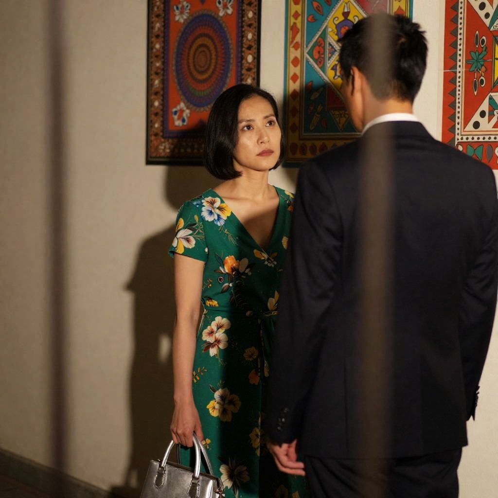 Photograph of two people standing close, partially shadowed. Woman with short black hair, floral green dress, holding silver handbag. Man with short black hair, dark suit, back to camera. Wall with colorful, patterned posters in background. Bars in foreground. Shadows of both people on wall. Intense, serious expressions.