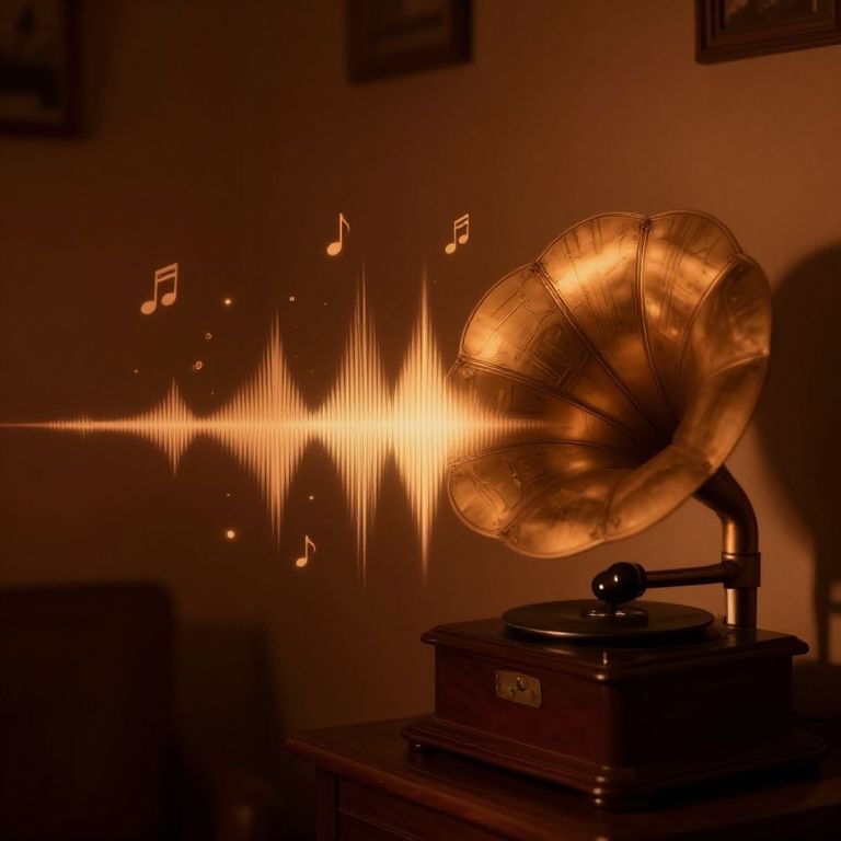 Brevis visualized as a dynamic soundwave pattern emanating from a vintage gramophone in a cozy, dimly lit room, musical notes floating in the air, warm tones of brown and orange, nostalgic and artistic ambiance