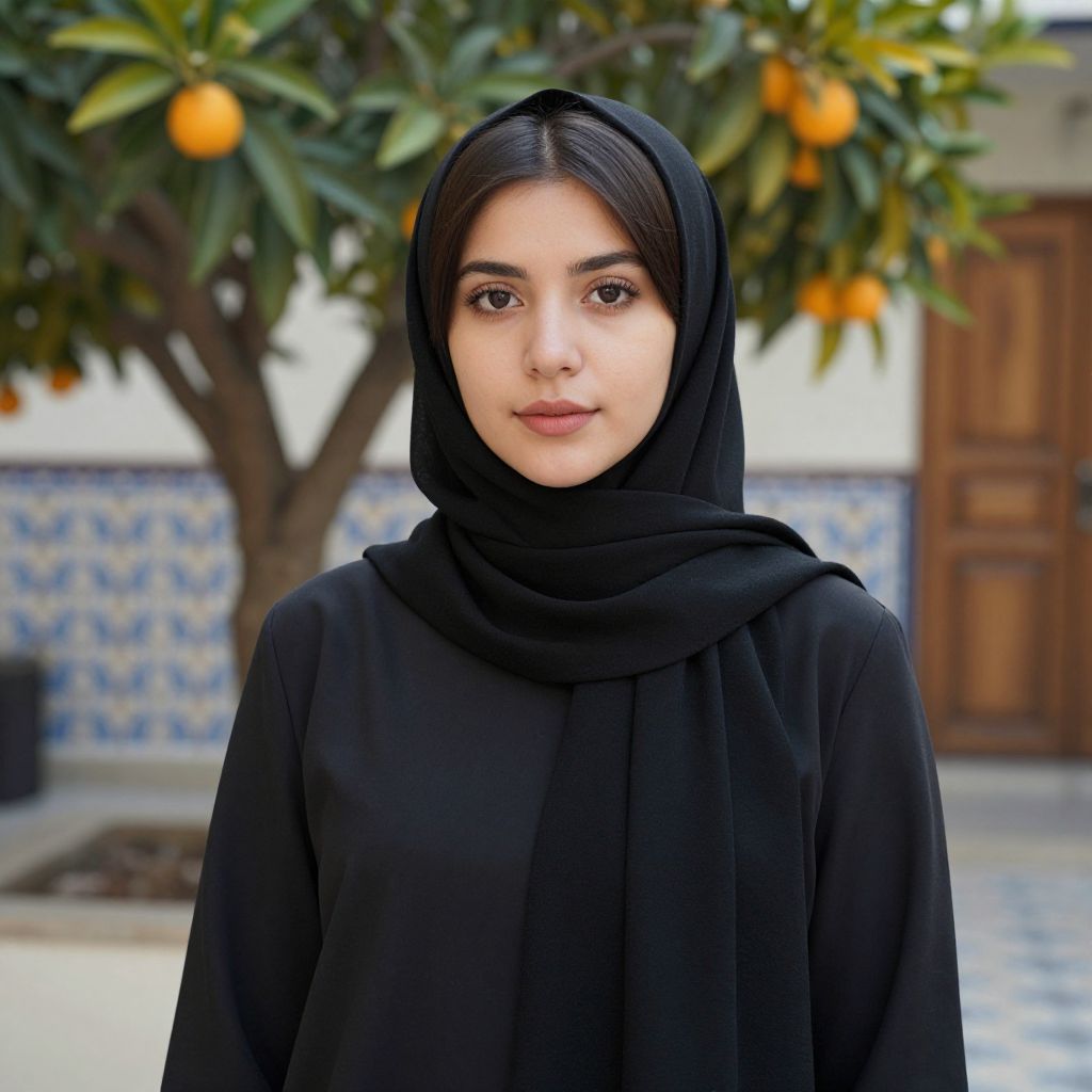Photograph of a young woman with fair skin and dark brown hair, wearing a black hijab and black long-sleeve top. She has dark brown eyes and a calm expression. Behind her is a orange tree with ripe oranges and a blue-and-white patterned tile wall. A wooden door is visible to the right. The background is slightly blurred, focusing attention on the woman's face and upper body. The setting appears to be an outdoor courtyard.
