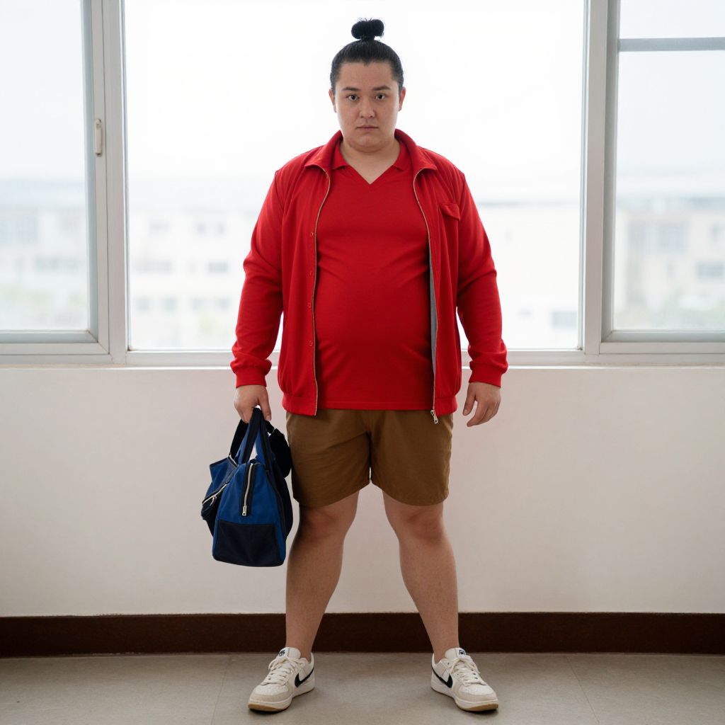 Photograph of a plus-sized Asian man with a topknot, wearing a red jacket, brown shorts, white sneakers, and holding a blue bag
