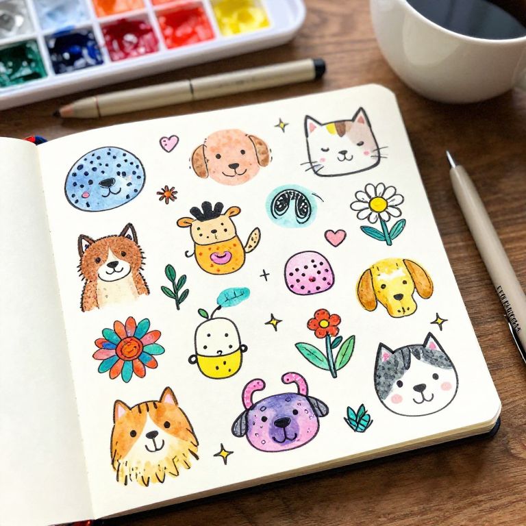 Doodle idea generator depicted as an open notebook with scattered colorful doodles including animals, faces, flowers, and geometric patterns, soft watercolor textures mixed with ink pen strokes, cozy atmosphere with coffee cup and art supplies nearby