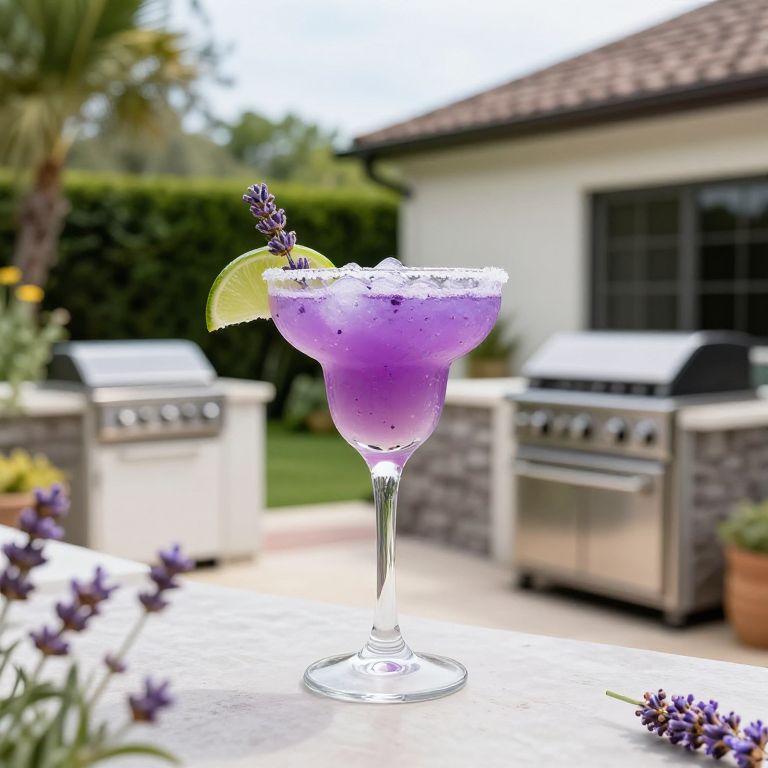 Wide-Angle Depth And Dimension a beautiful image of a Lavender Margarita in a impresive home backyard, outdoor kitchen, lifestyle, photorealistic,