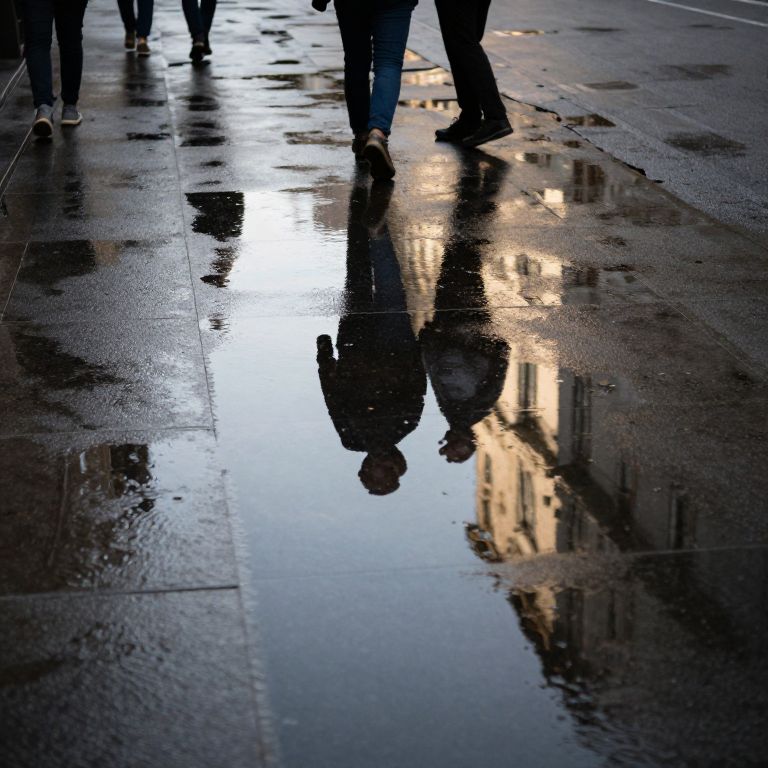 Reflections dance upon the wet pavement, mirroring not just the figures above but the silent whispers of a city's dreams, where the mundane becomes surreal and the echoes of solitude blend with the rhythm of life.