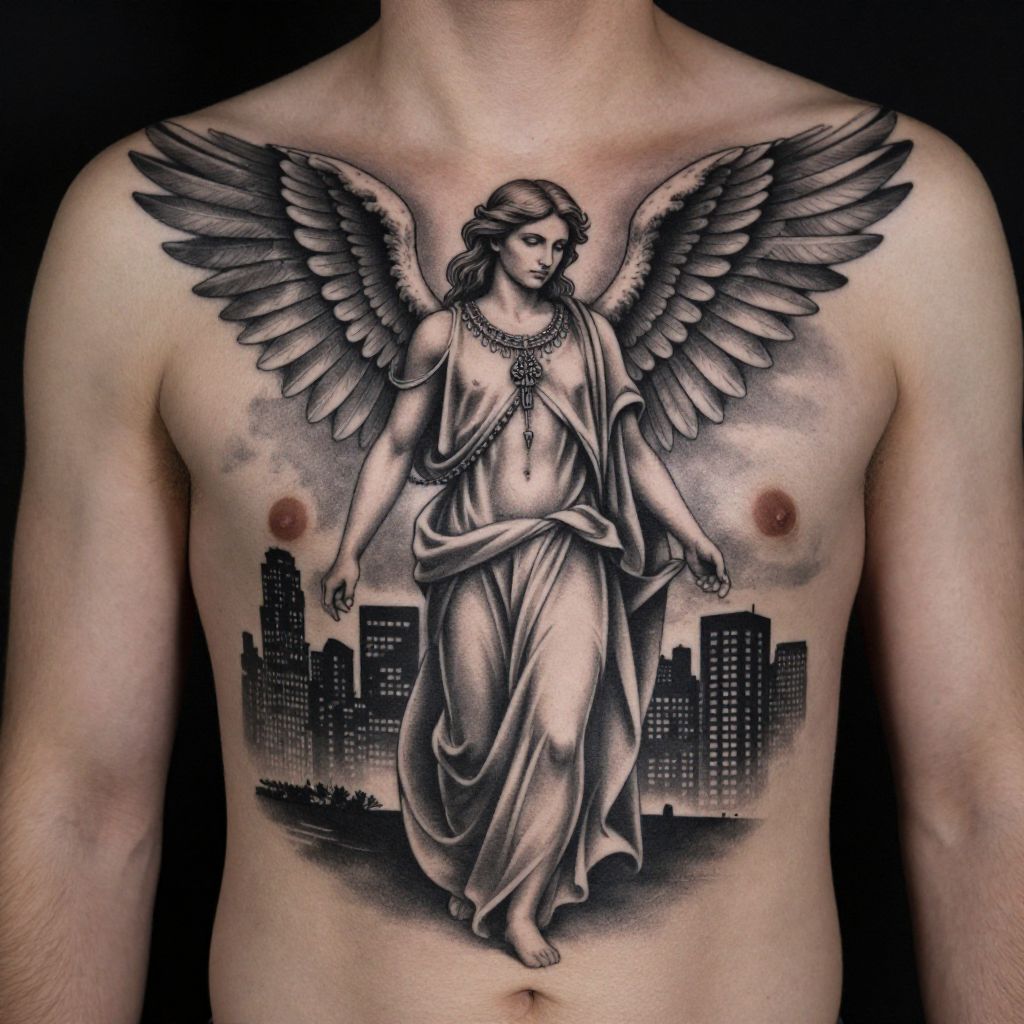 Angel tattoo for men capturing a powerful guardian angel standing protectively over a city skyline at night, wings partially unfolded, rendered in a dramatic chiaroscuro style with detailed line work and smooth gradients in grayscale.