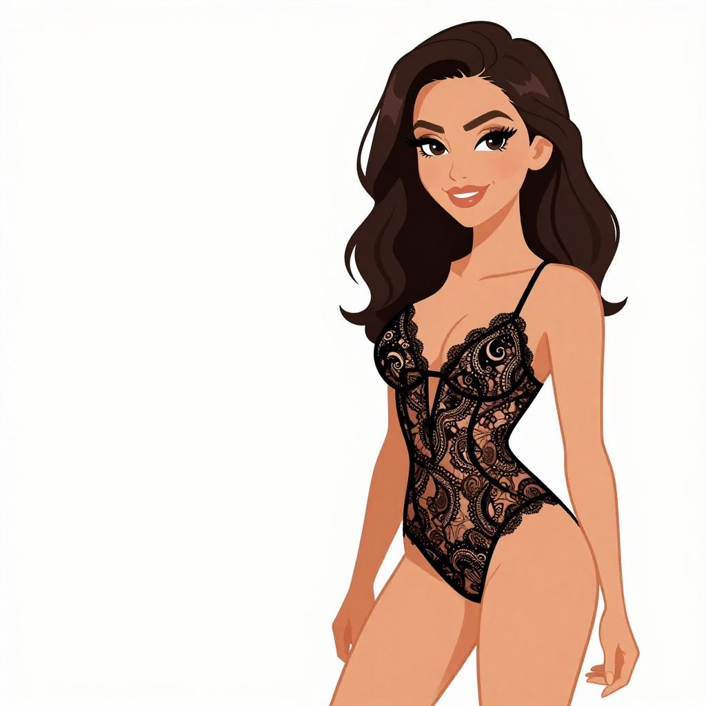 Digital illustration of a confident woman with long, wavy dark brown hair and fair skin. She wears a black lace bodysuit with intricate floral patterns, thin spaghetti straps, and a plunging neckline that accentuates her medium-sized breasts. She has a slight smile, arched eyebrows, and dark brown eyes. Her pose is relaxed, with one arm slightly bent and the other hanging by her side. The background is completely white, making her the focal point. The art style is vibrant and modern, with bold colors and clean lines.
