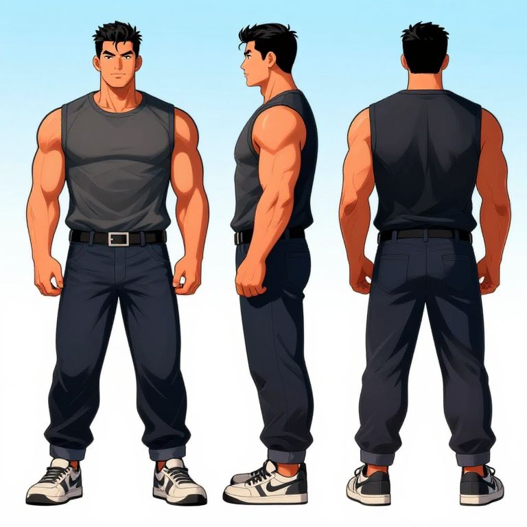 Male character turnaround art piece displaying comic book style, emphasis on muscular physique, casual streetwear, clear separation of views from front, side and back, bold outlines, vibrant colors, simple gradient background