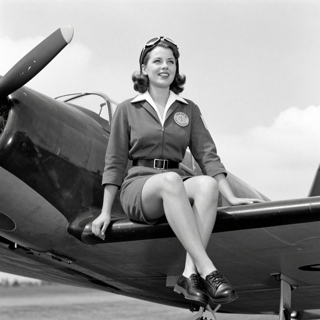 A vintage black-and-white photograph captures a confident woman pilot from the Women Airforce Service Pilots (WASP) program during World War II, seated on the wing of a propeller-driven aircraft, exuding a retro charm and historical significance.